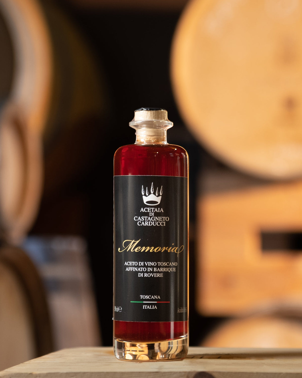Questo prodotto viene ottenuto dalla fermentazione acetica del vino e affinato in barrique, botti di rovere precedentemente utilizzate per i migliori vini di Bolgheri e che di quest’ultimi hanno trattenuto gli aromi. Ne risulta un aceto di vino alla maniera classica, in due versioni: quella ottenuta da sole uve bianche e quella ottenuta da sole uve rosse. “Memoria” si caratterizza per il genuino metodo di produzione contadina di una volta (da cui il nome), per un sapore tradizionale e segnato dalla qualità del vino IGT toscano arricchito di pregiati tannini.